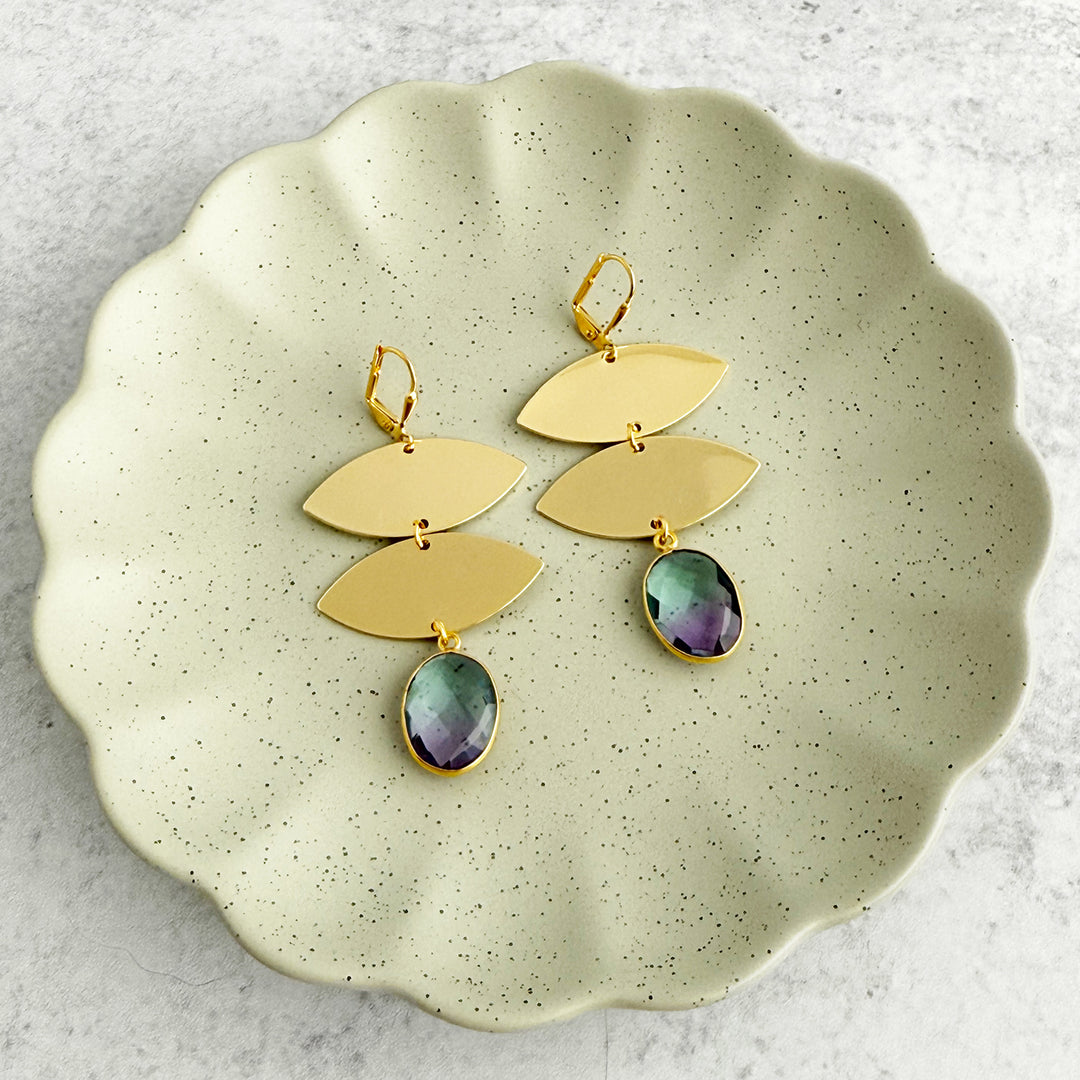 Beaded Stone Brushed Brass Fan Dangle Earrings in Gold