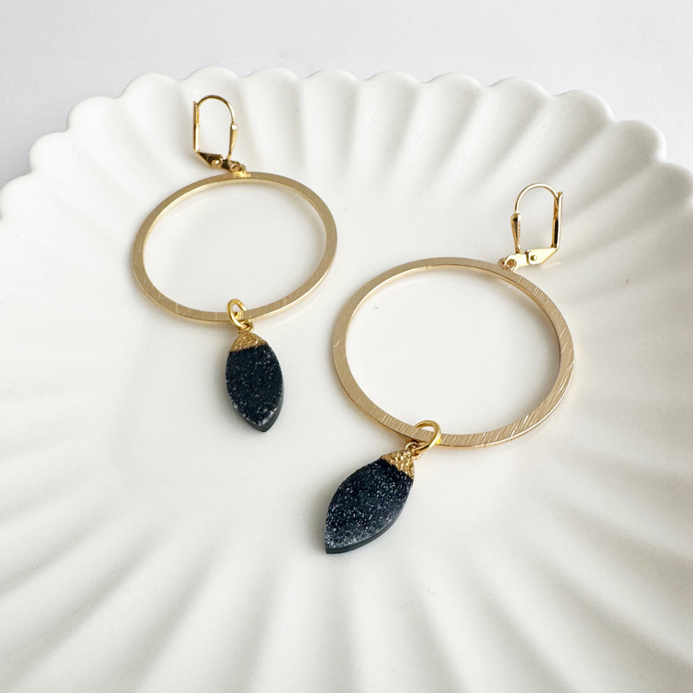 Black Druzy Hoop Statement Earrings in Brushed Silver