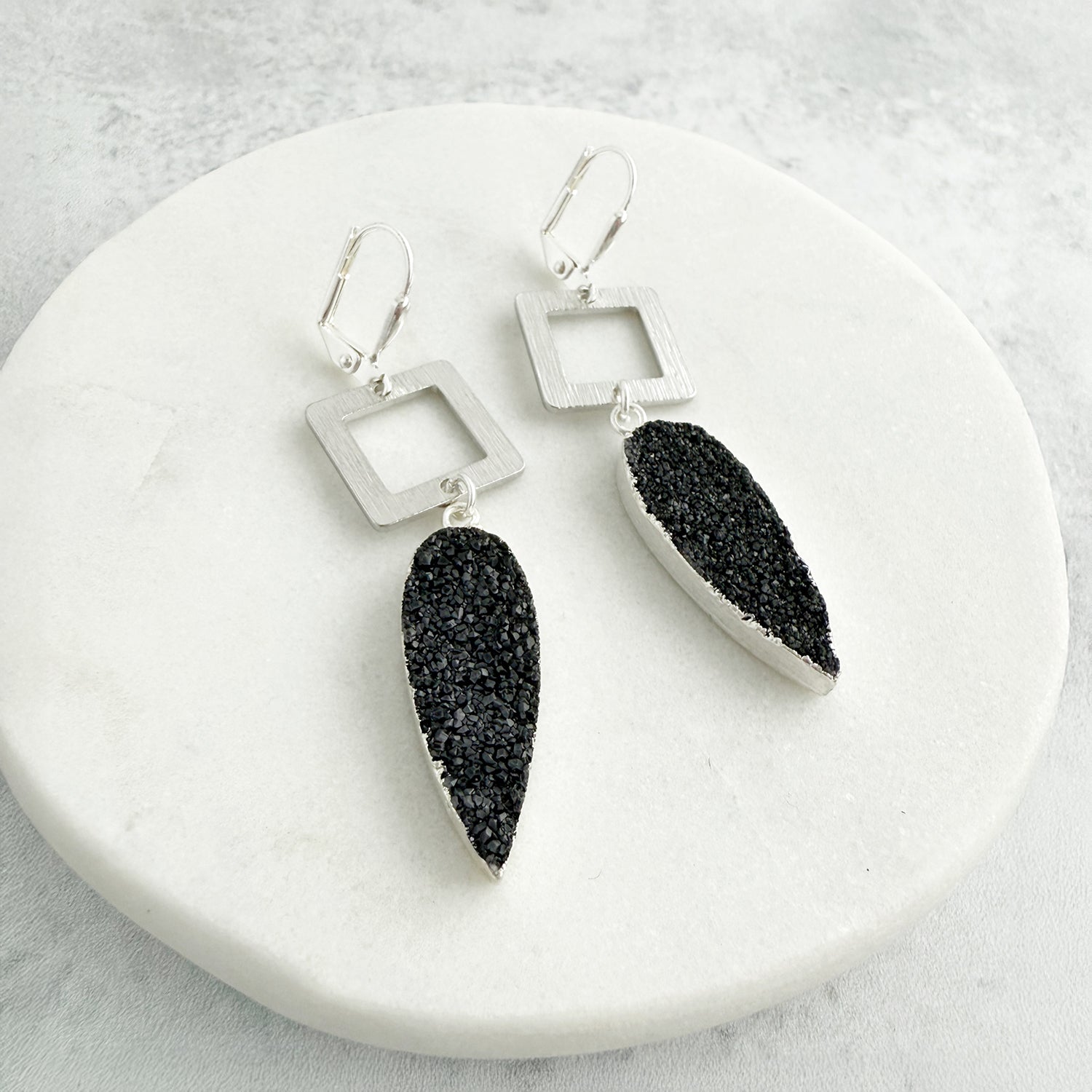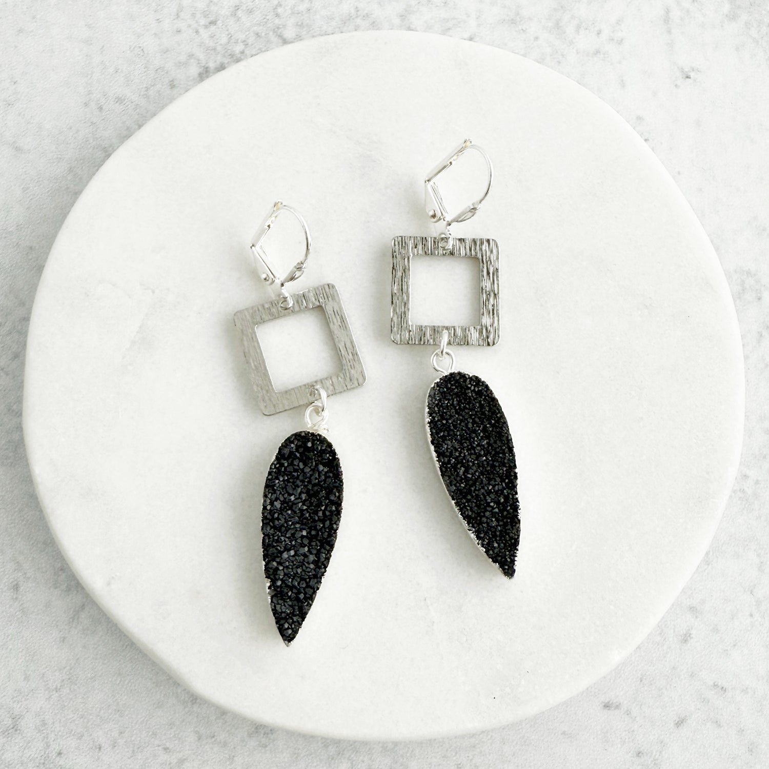 Shimmer with subtle texture. The Druzy Inverted Teardrop and Brushed Silver Square Earrings pair sparkling natural druzy with sleek geometric design. Perfect for adding a bit of edge and shine to your everyday style.