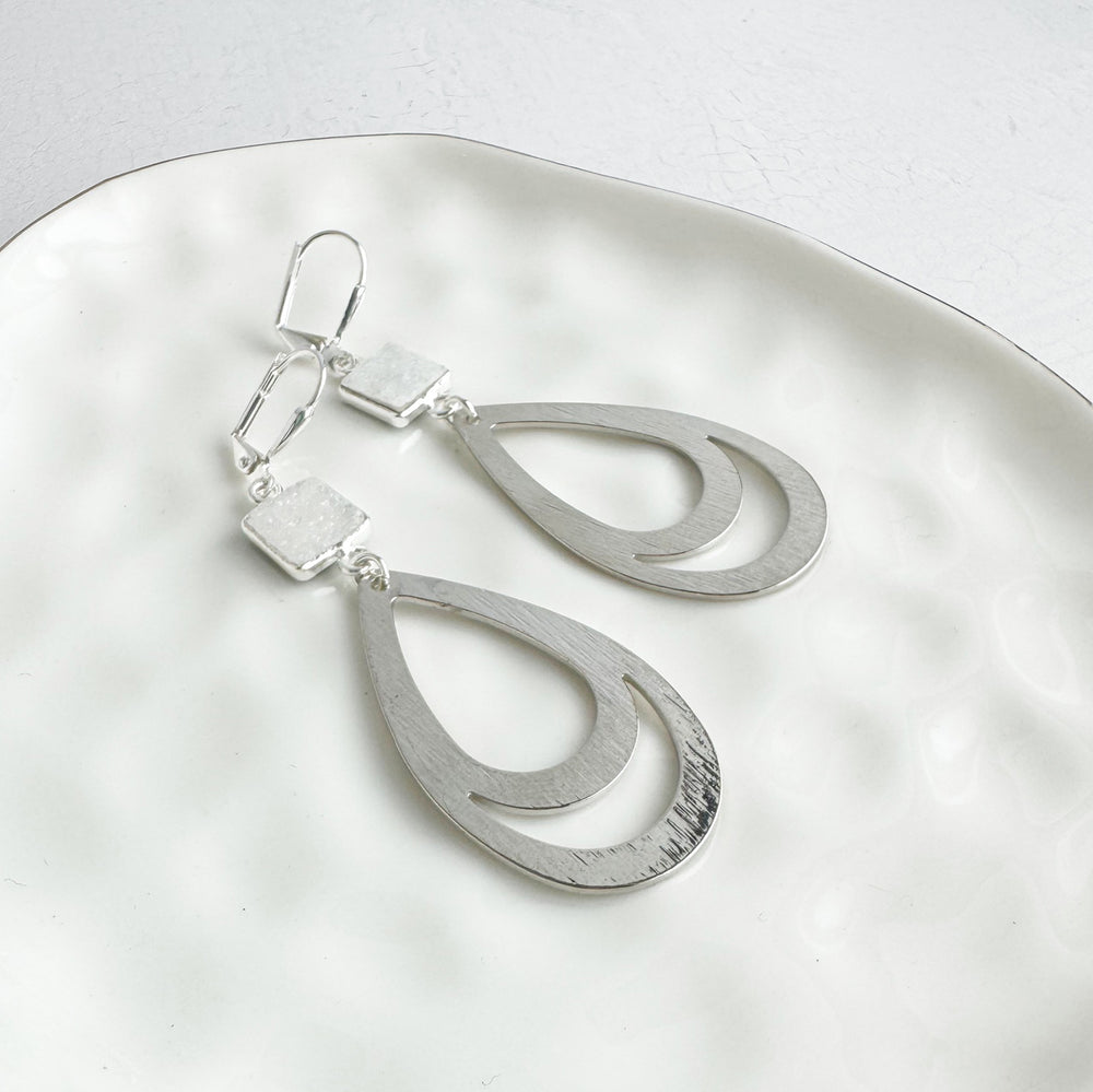 White Druzy Double Teardrop Earrings in Brushed Silver