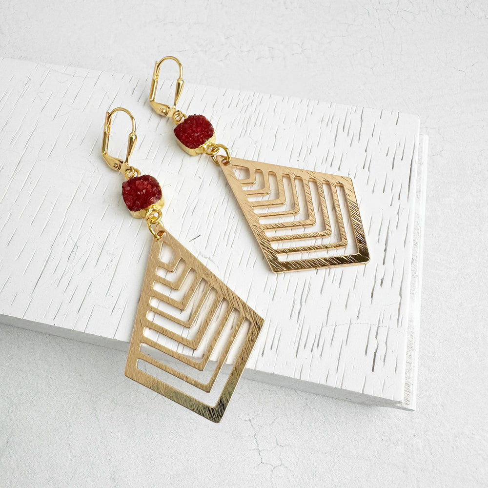Burnt Orange Druzy Diamond Dangle Earrings in Brushed Gold