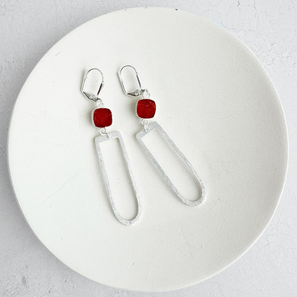 Elongated Hexagon and Orange Druzy Earrings in Brushed Gold or Silver