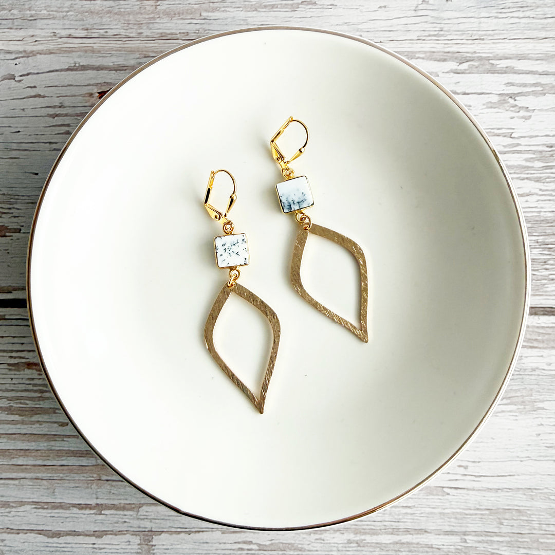 Dendrite Opal Halo Drop Dangle Earrings in Brushed Gold