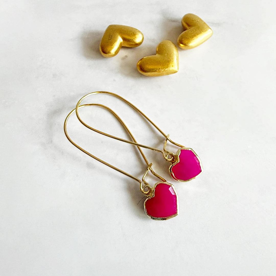 Simple Fuchsia Chalcedony Heart Drop Earrings in Gold