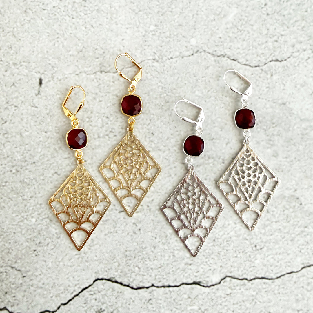 Garnet and Webbed Diamond Dangle Earrings