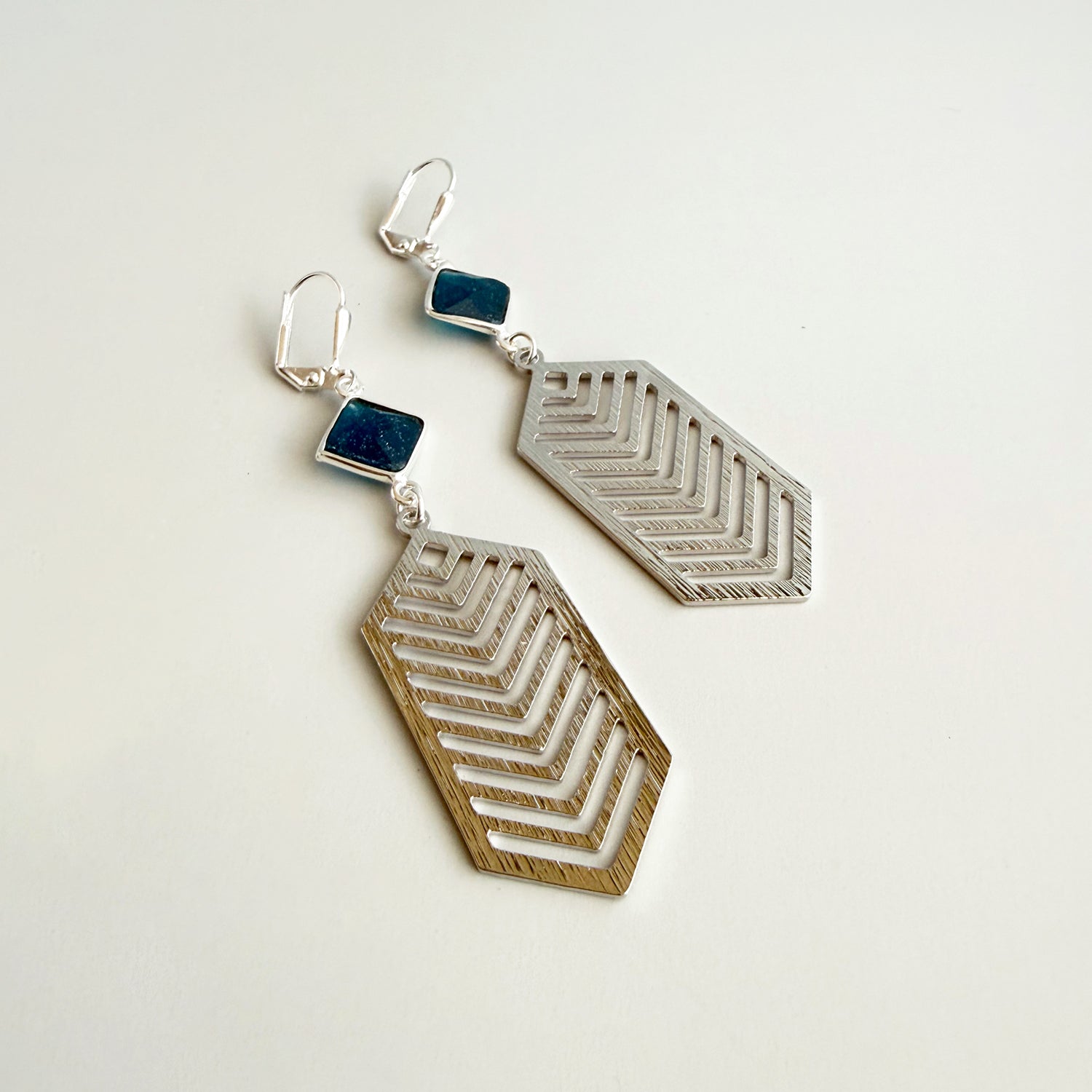 Layered hexagon shapes add movement, while vibrant apatite stones bring a bright, ocean-inspired hue. Finished in silver for a cool, polished look.