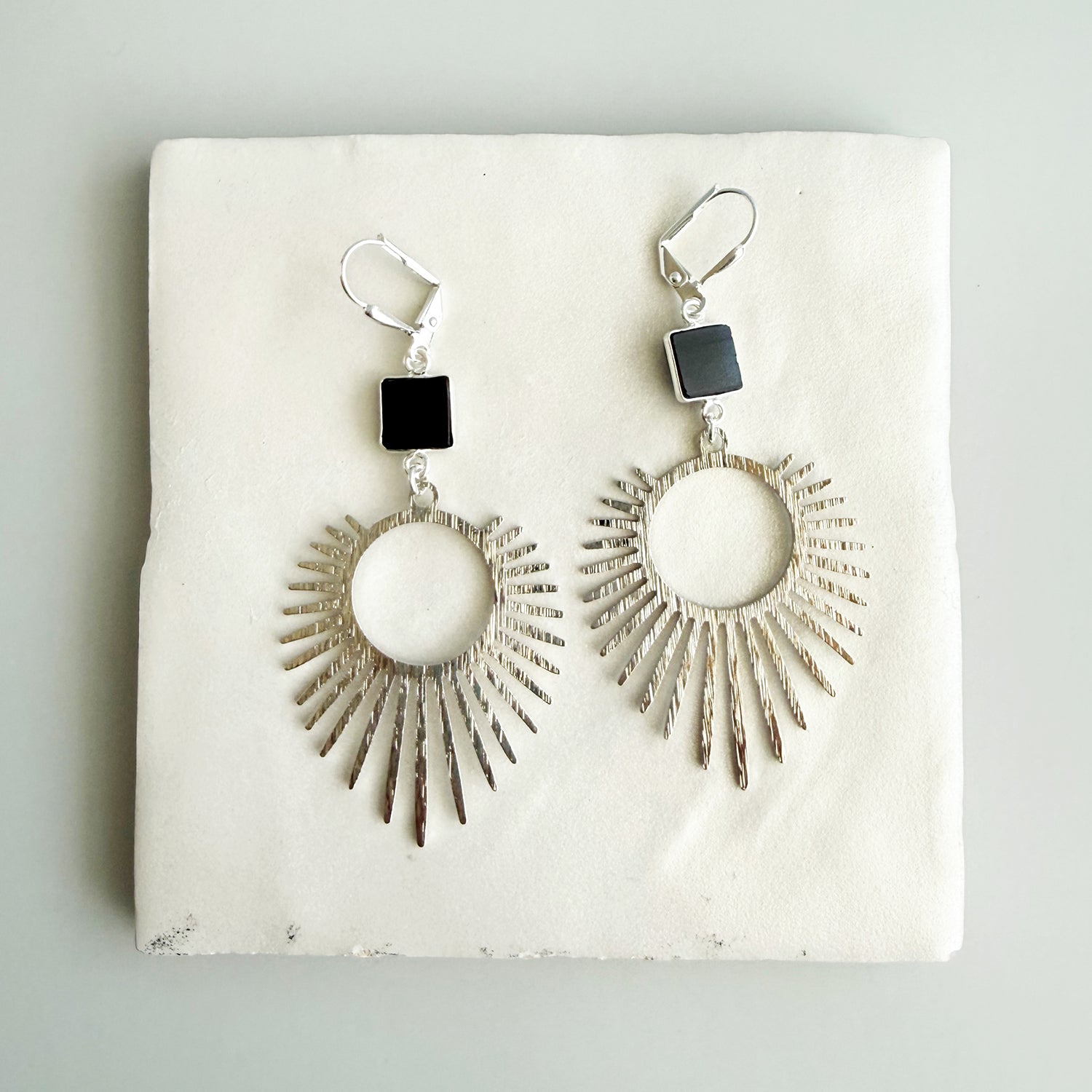 Black Onyx Sunburst Statement Earrings in Brushed Silver