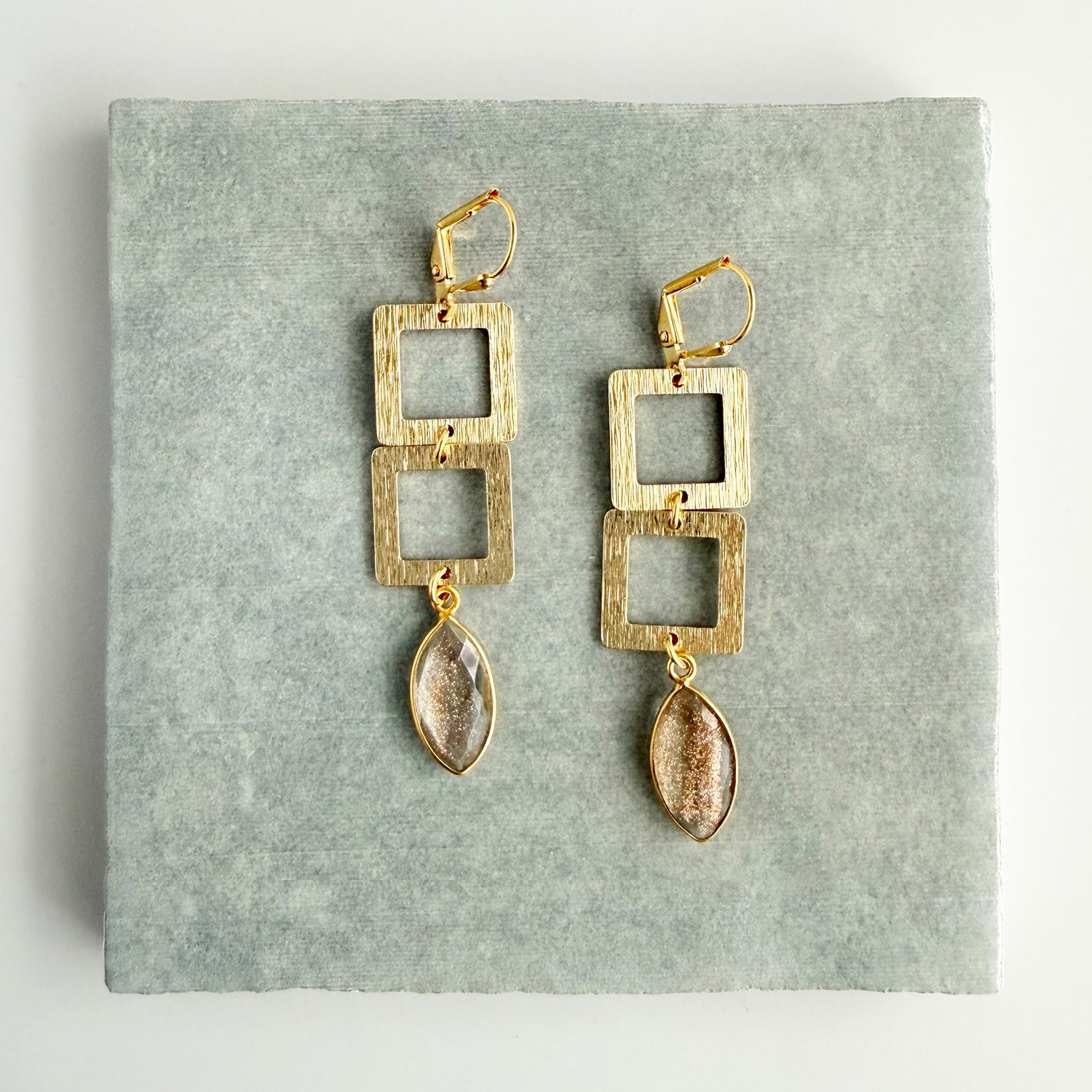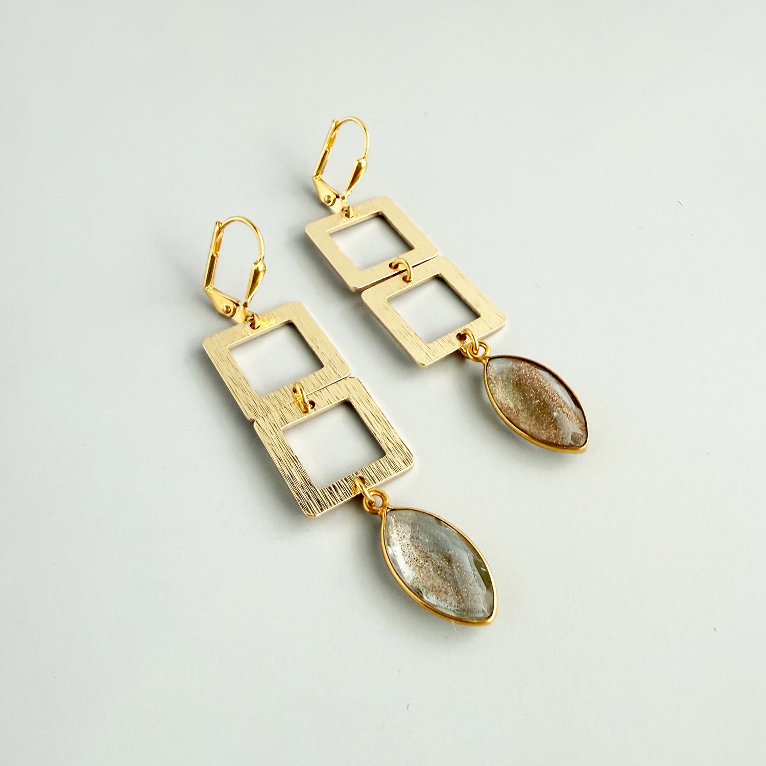 Unique copper-infused stones create striking natural patterns in these square dangle earrings. Framed in brushed gold, the geometric shape and rich tones make these earrings a standout statement piece.