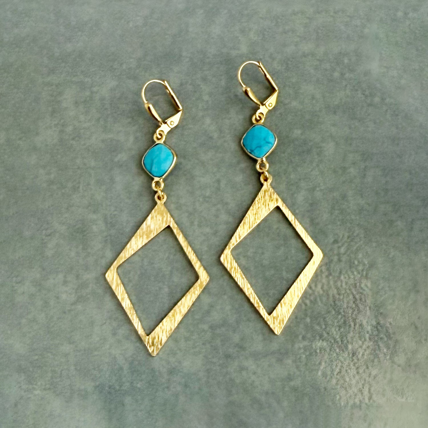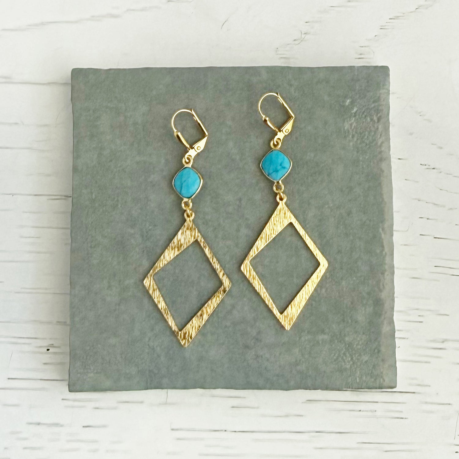 Turquoise howlite brings that signature blue-green energy, while brushed gold diamond-shaped pendants add modern sophistication. These earrings work as hard as you do, transitioning seamlessly from coffee runs to client meetings to dinner with friends.