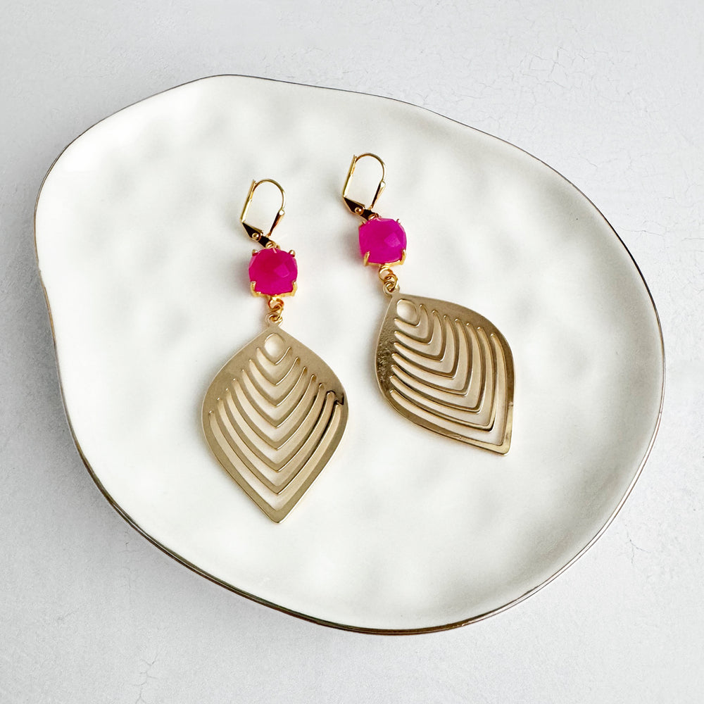 Fuchsia Chalcedony Marquise Leaf Earrings in Brushed Gold