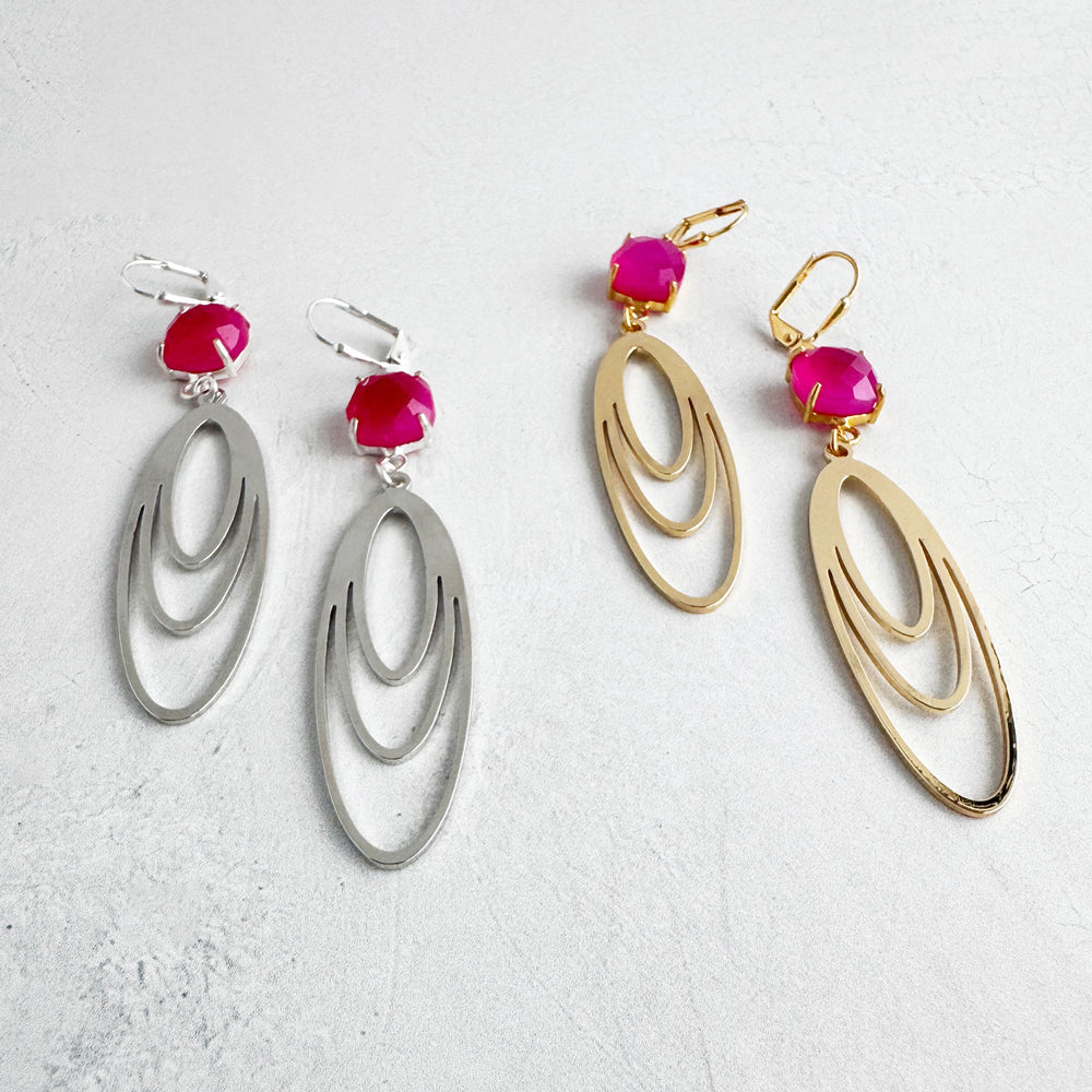 Pink Chalcedony and Layered Oval Earrings in Brushed Gold and Silver