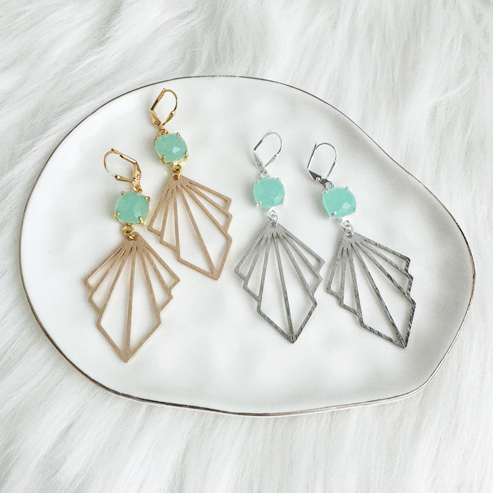 Aqua Chalcedony Prong Layered Fan Statement Earrings in Brushed Gold and Silver