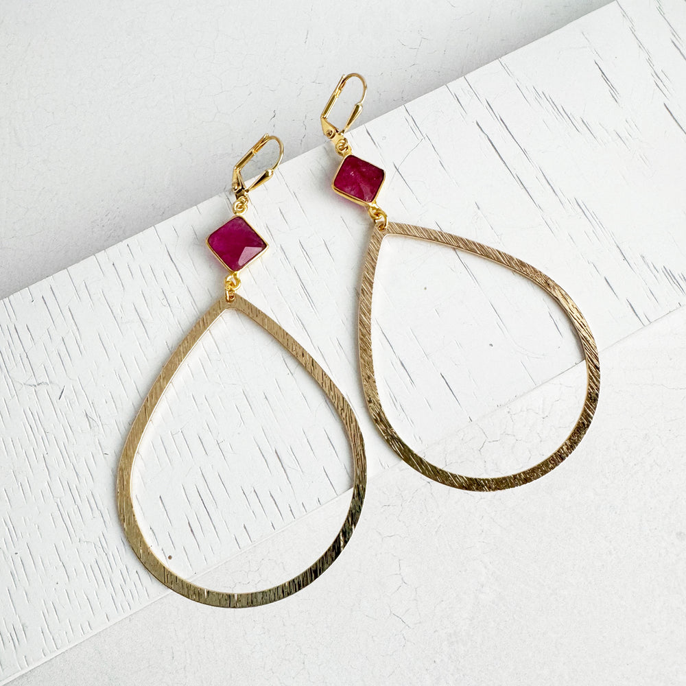 Large Ruby Teardrop Statement Earrings in Brushed Gold