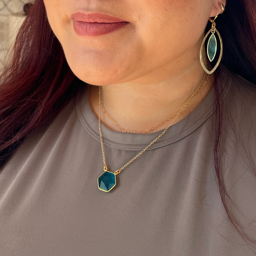 Long Emerald Teardrop Bezel Stone Statement Necklace in Gold and Silver