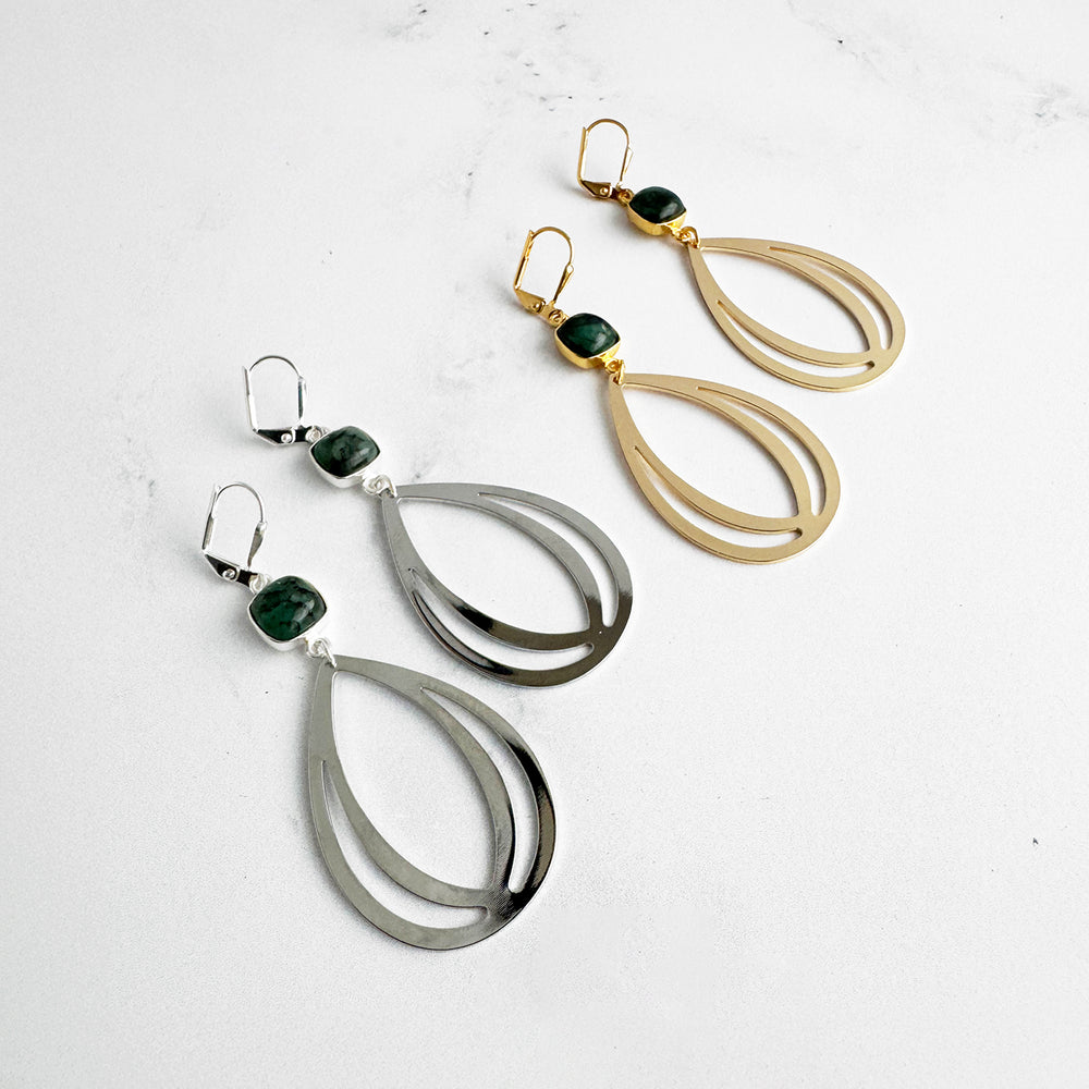 Large Emerald Teardrop Statement Earrings in Brushed Gold