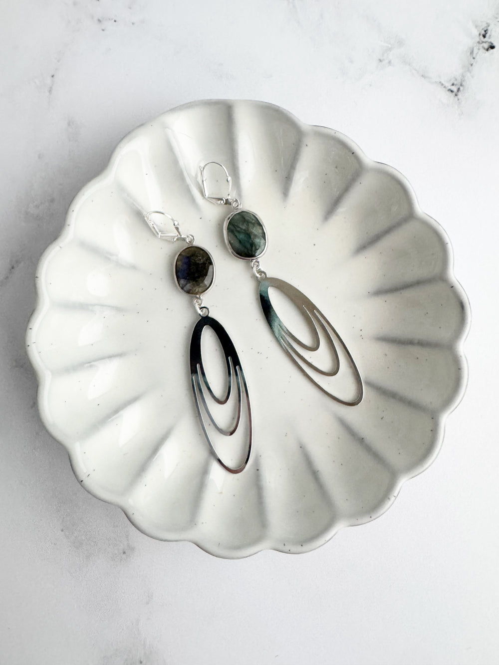 Labradorite Stone and Long Oval Statement Earrings in Silver