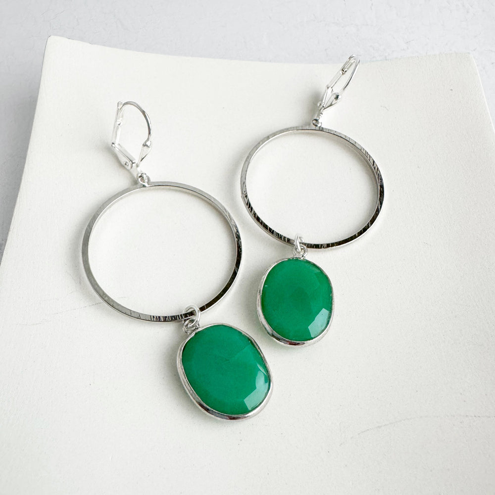 Green Onyx Hoop Dangle Earrings in Brushed Silver