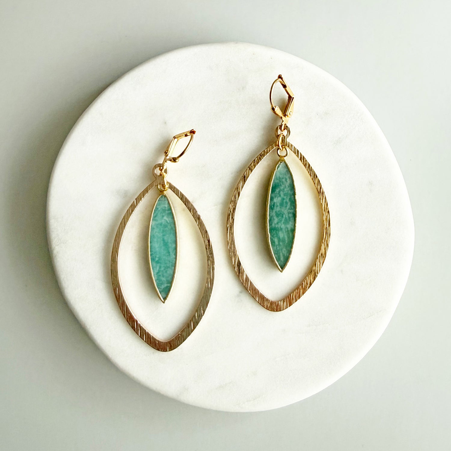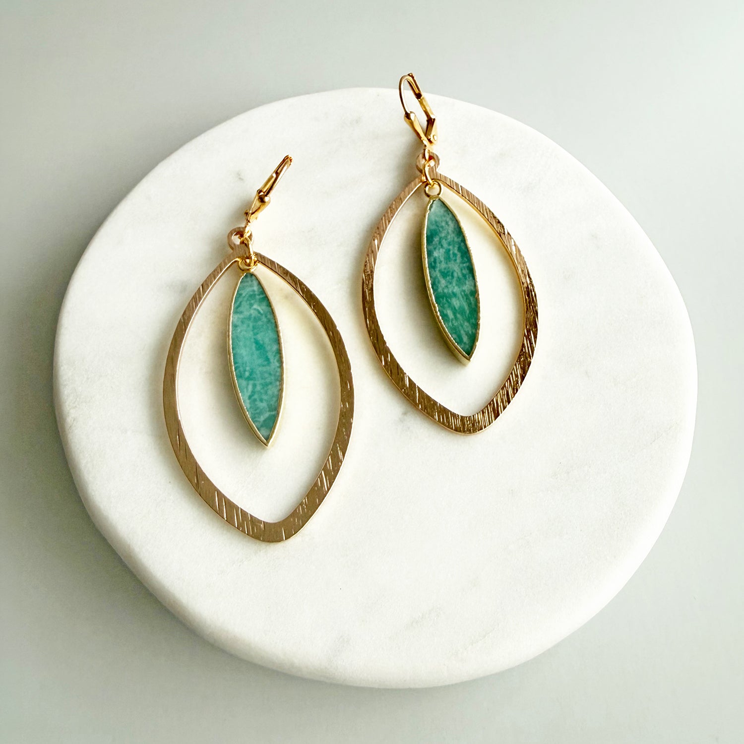 Calming amazonite stones set in elegant marquise shapes create a statement that's bold yet wearable. Finished in gold, these earrings bring soft color, natural texture, and effortless sophistication to your jewelry rotation.