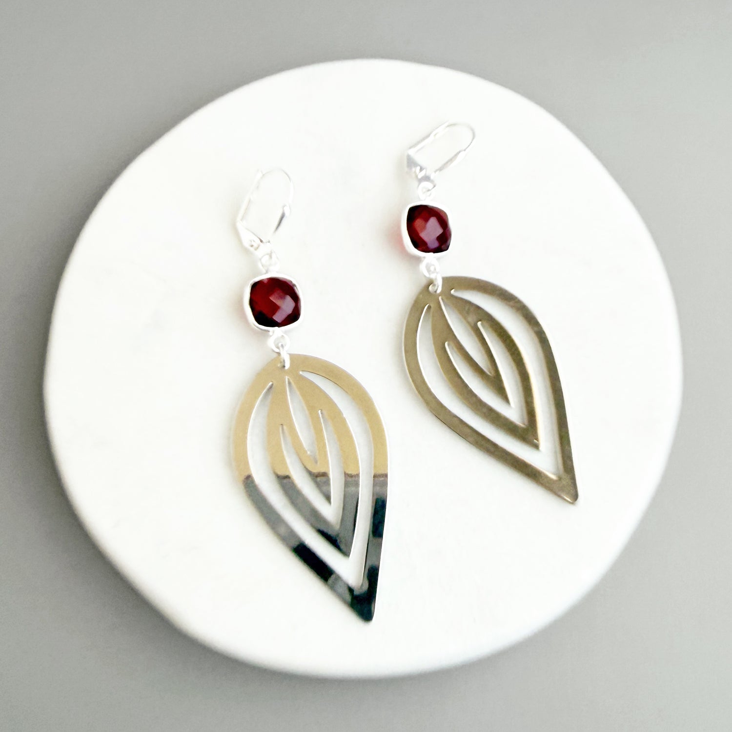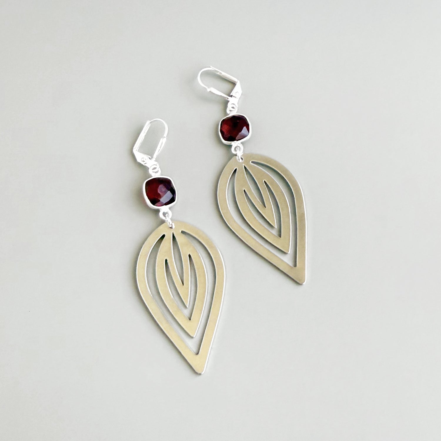 Bold garnet stones meet smooth silver lotus shapes for a statement that's both grounded and graceful. These earrings bring depth, contrast, and an artful silhouette to everyday or evening looks.