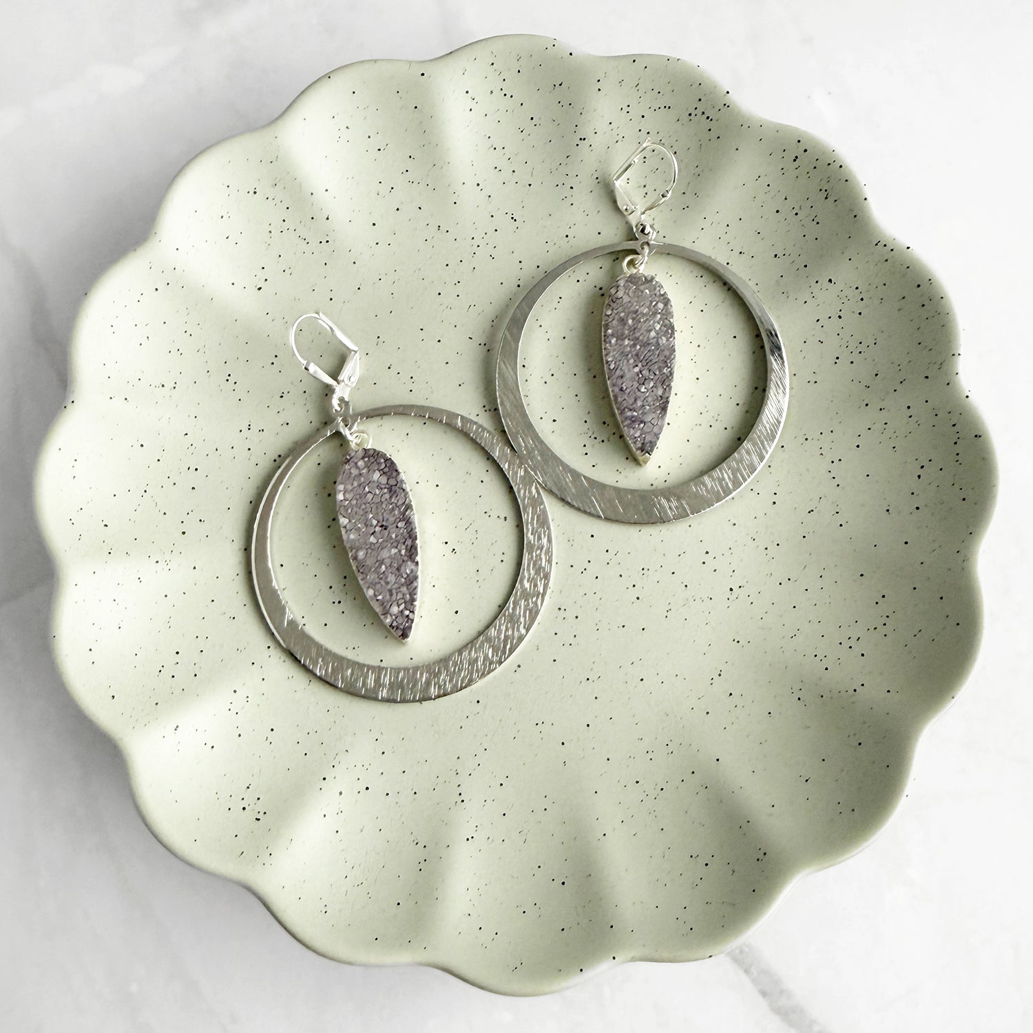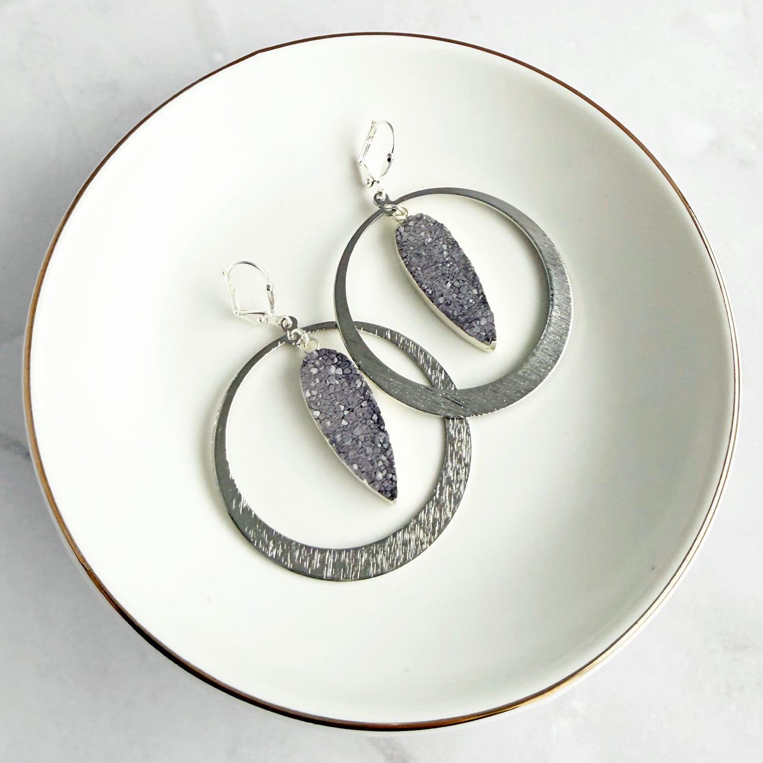 Natural gray druzy stones bring subtle sparkle to classic brushed silver hoops. Bold yet versatile, these earrings are perfect for elevating everyday style with a hint of shine.