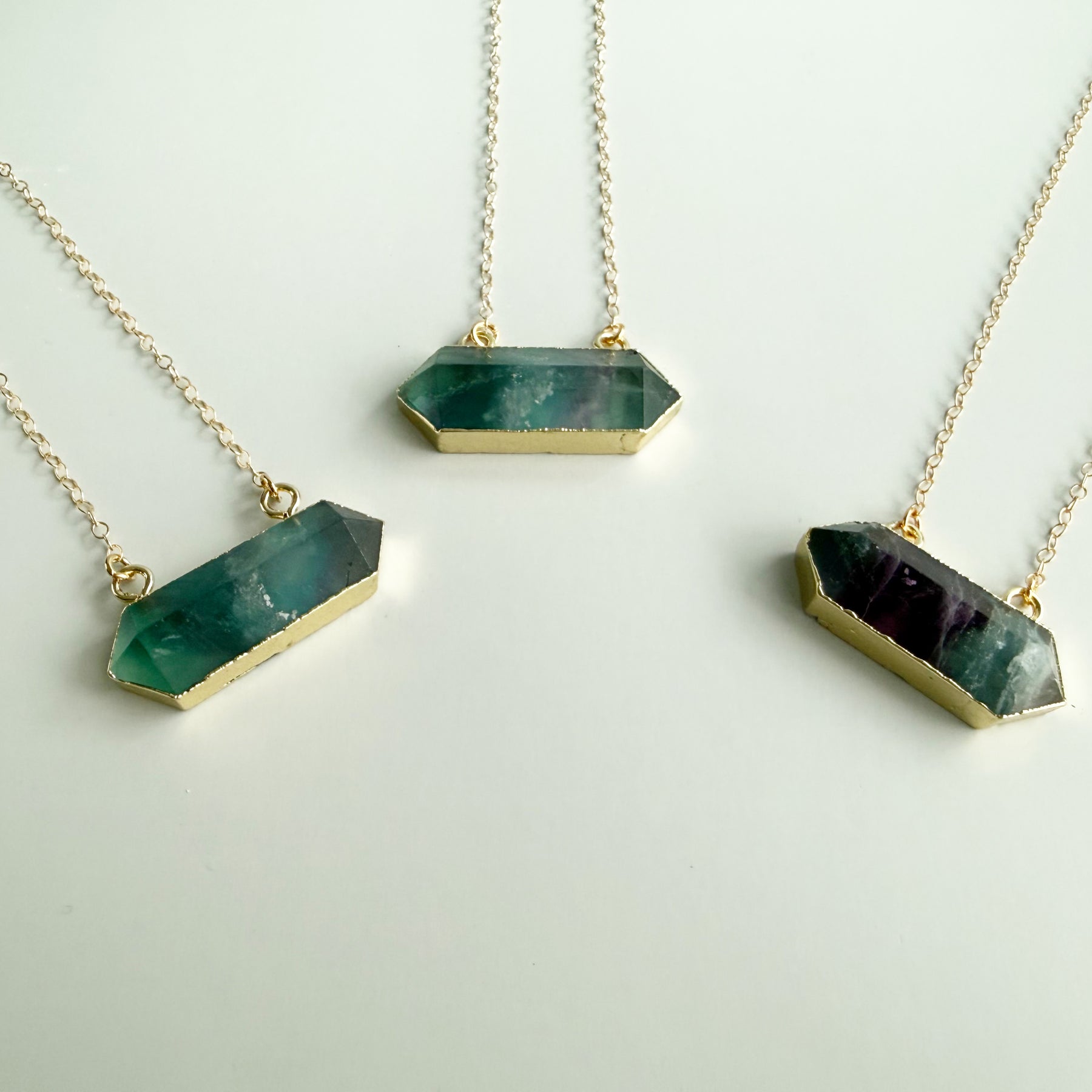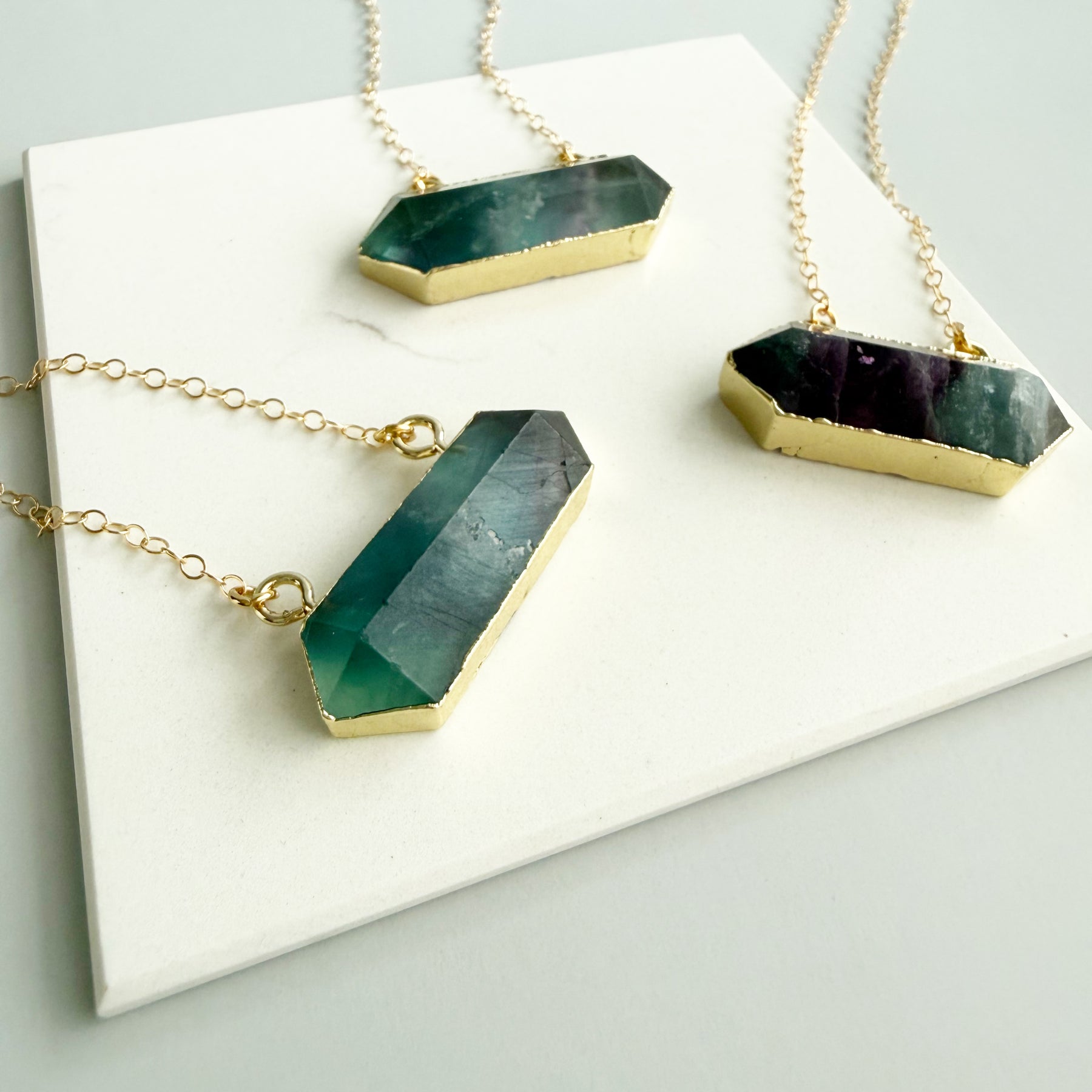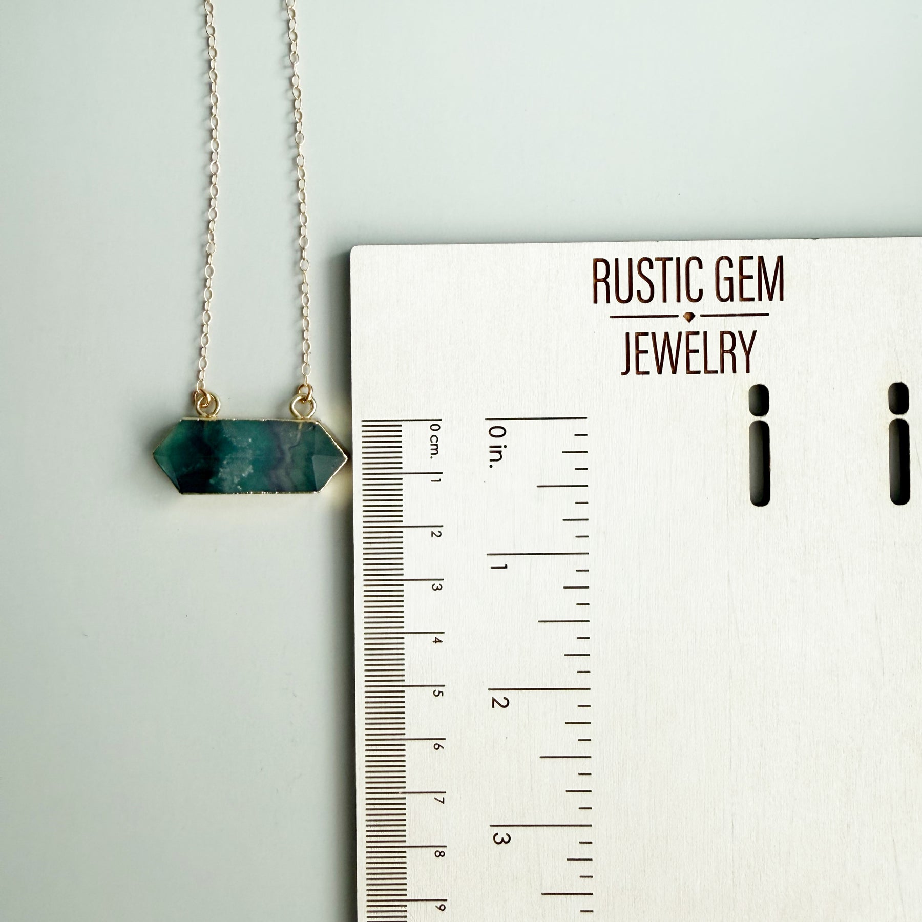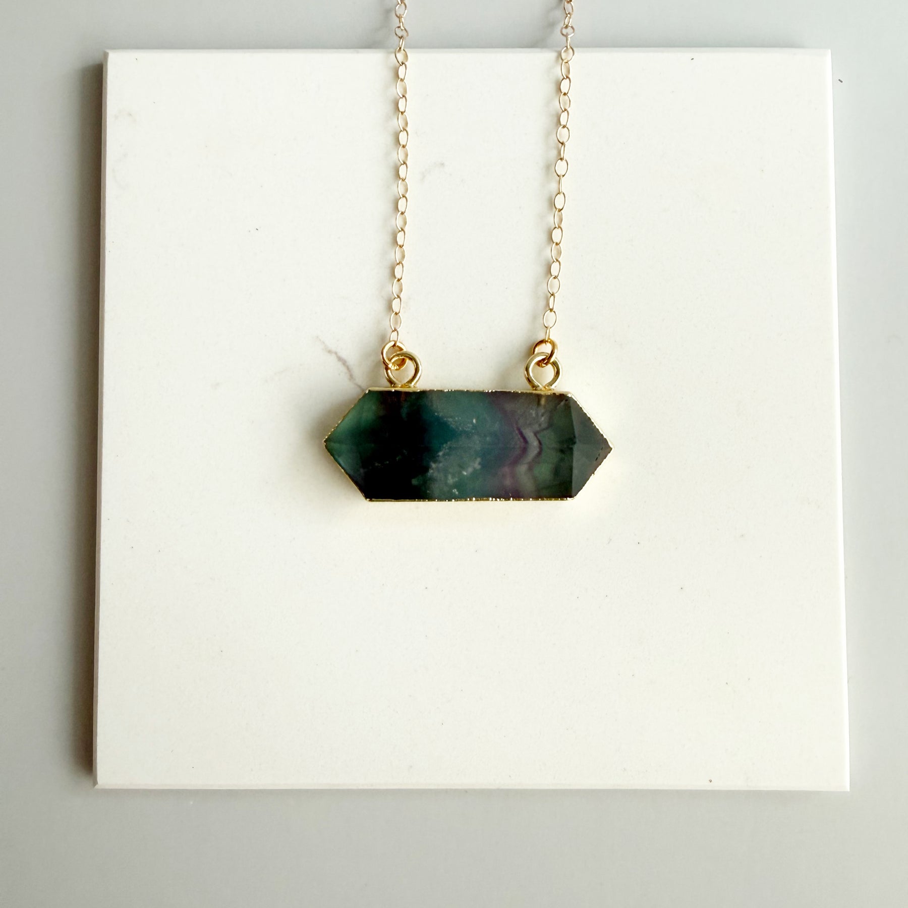 This statement necklace features a genuine fluorite stone in a modern bar / rhombus shape (approx. 1.25"–1.5" wide), each one naturally unique in color and pattern. Suspended from an 18" 14k gold-filled chain, it sits perfectly at the collarbone for an on-trend, confident look.