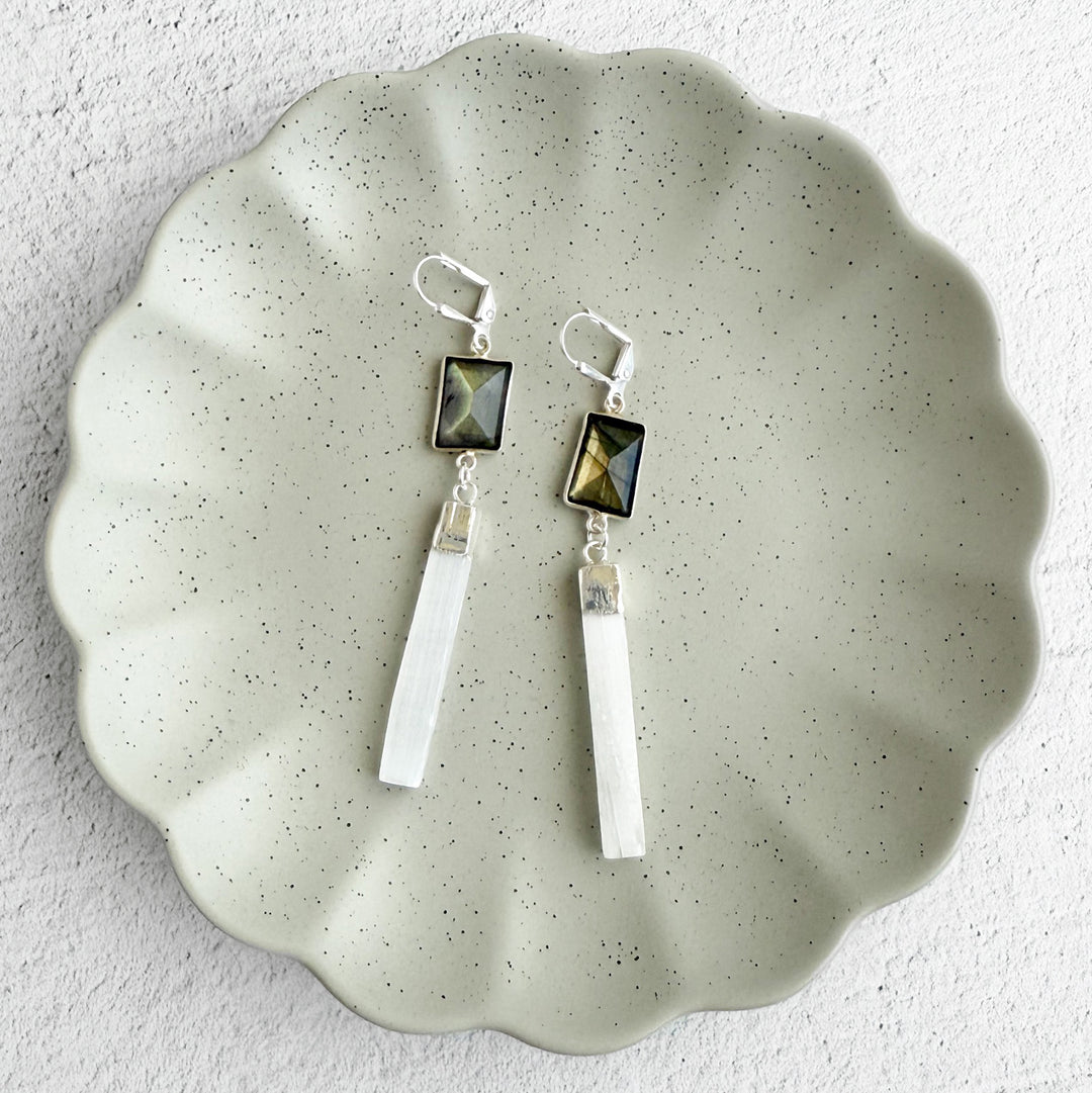 Labradorite and Selenite Bar Drop Earrings in Silver