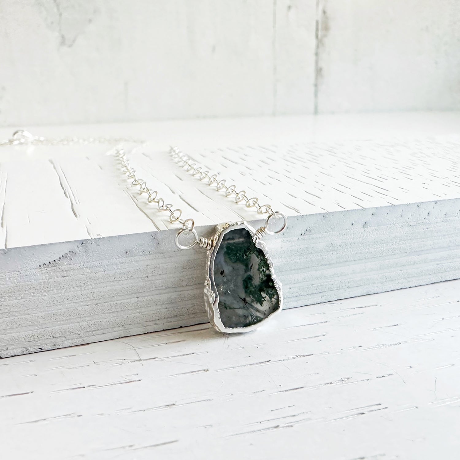 Moss Agate Gemstone Slice Necklace in Sterling Silver