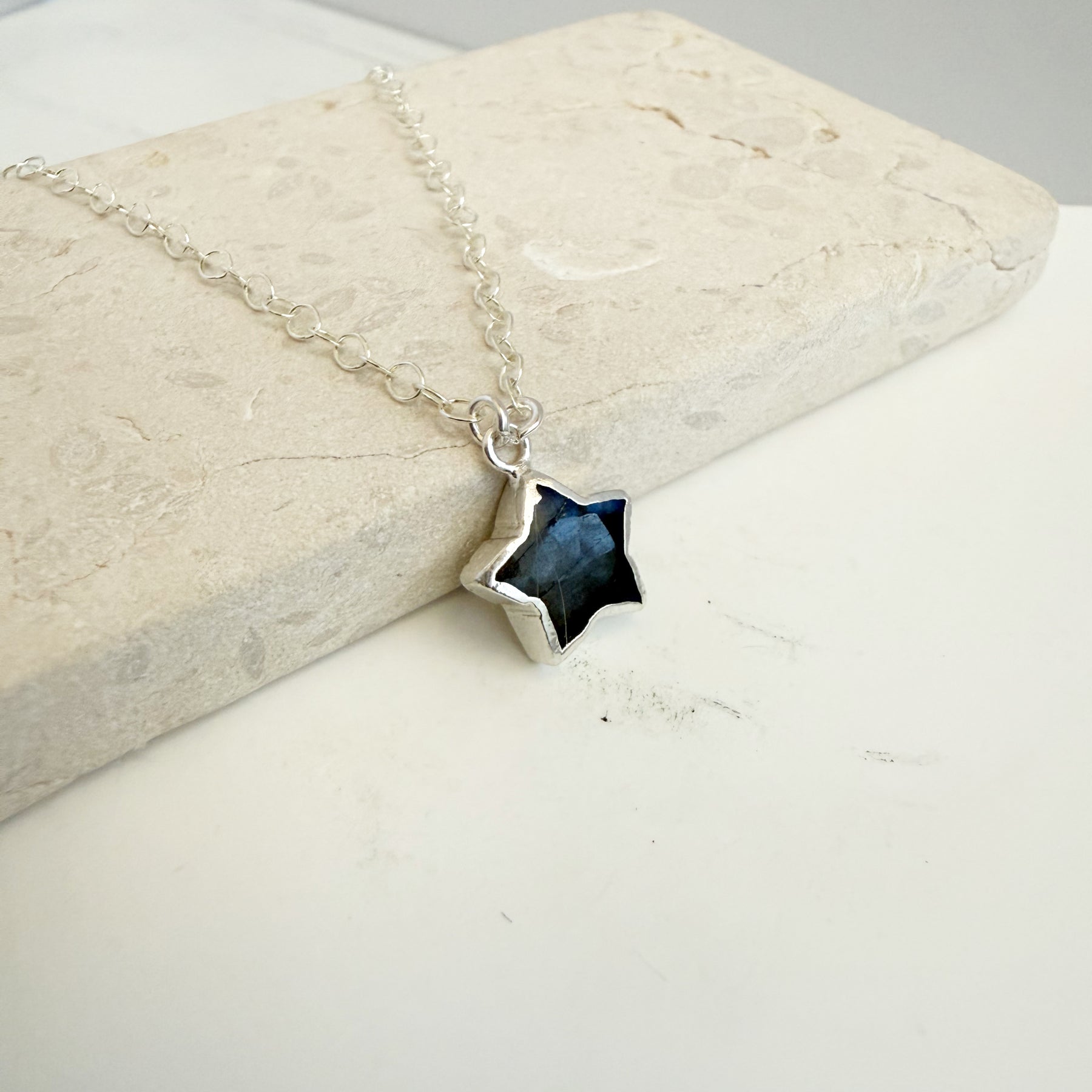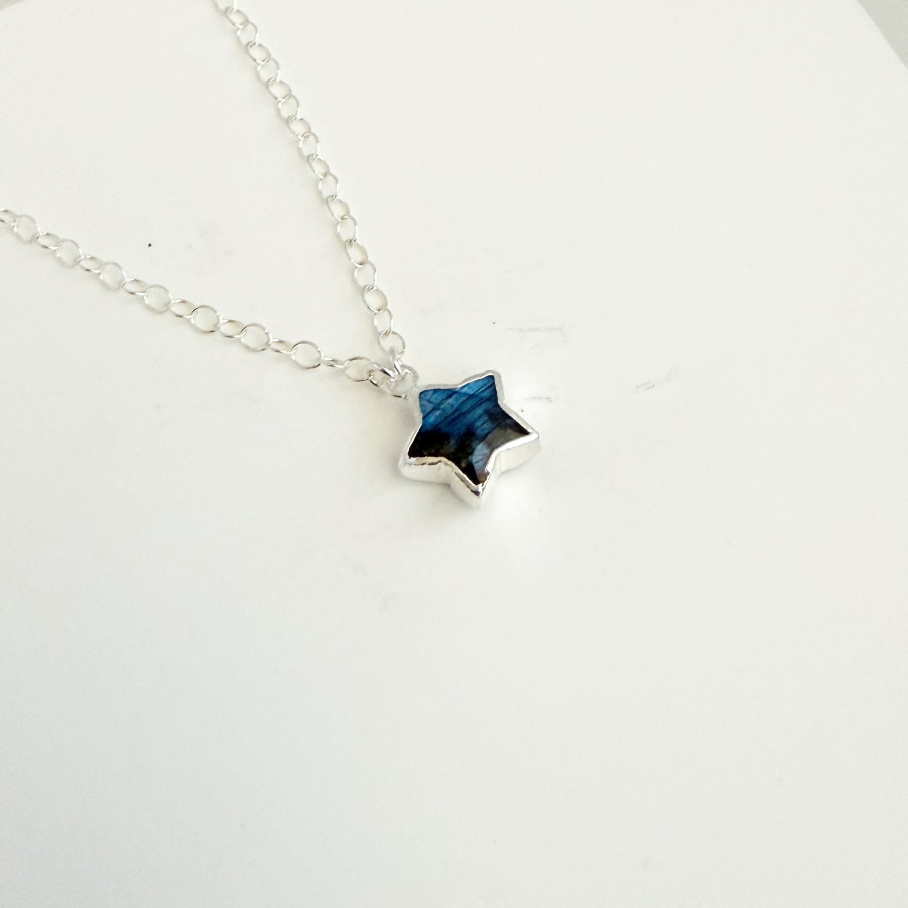So versatile and the perfect layering piece! The star shaped gemstone is labradorite and measures about 18x16mm. The chain is 18" long on dainty sterling silver chain.