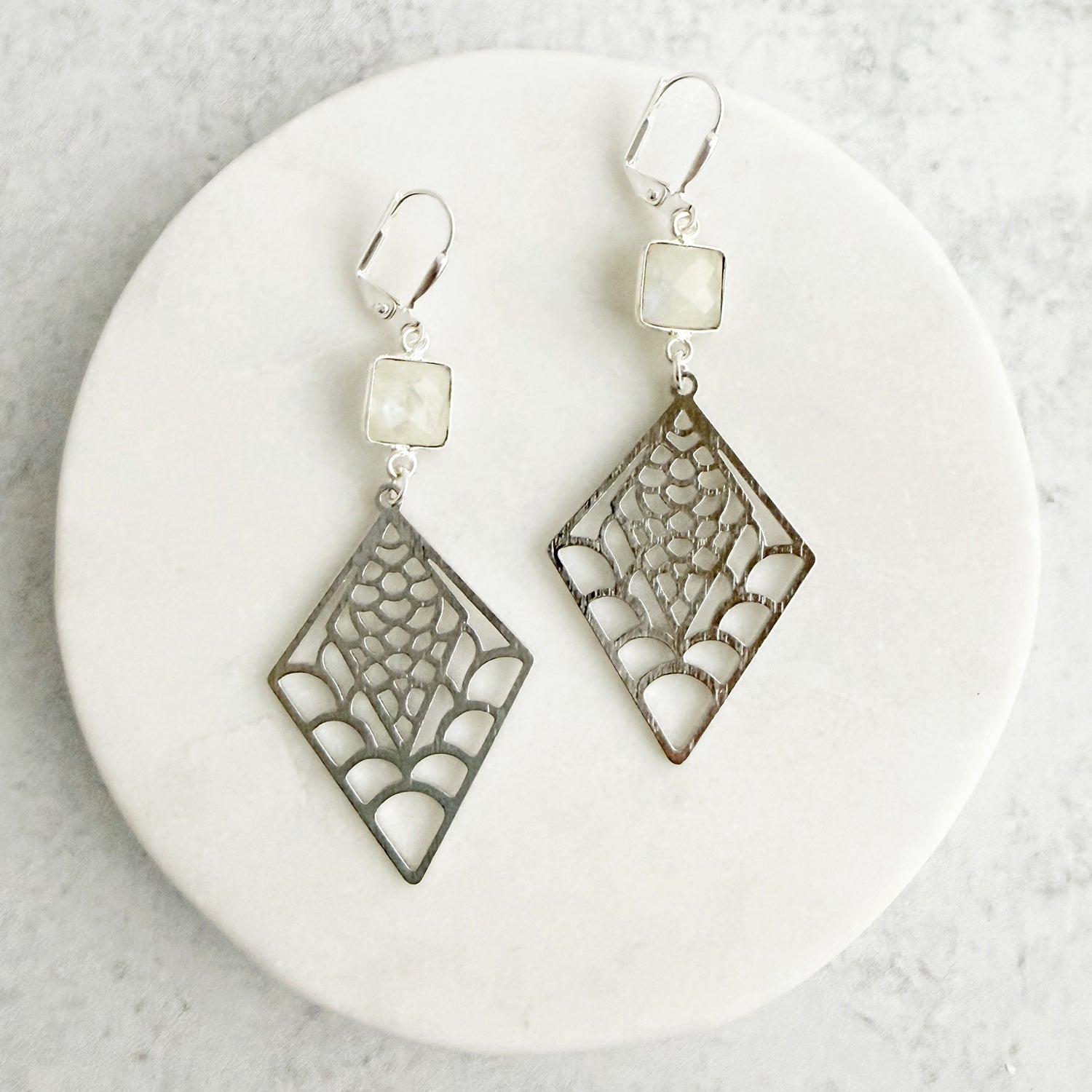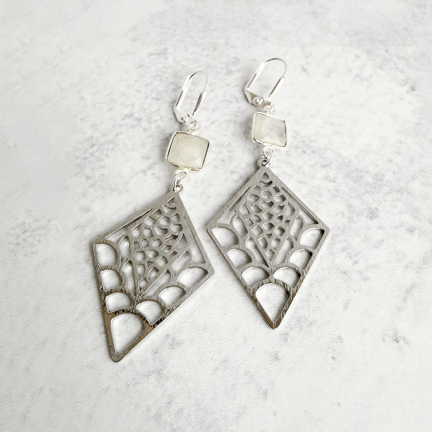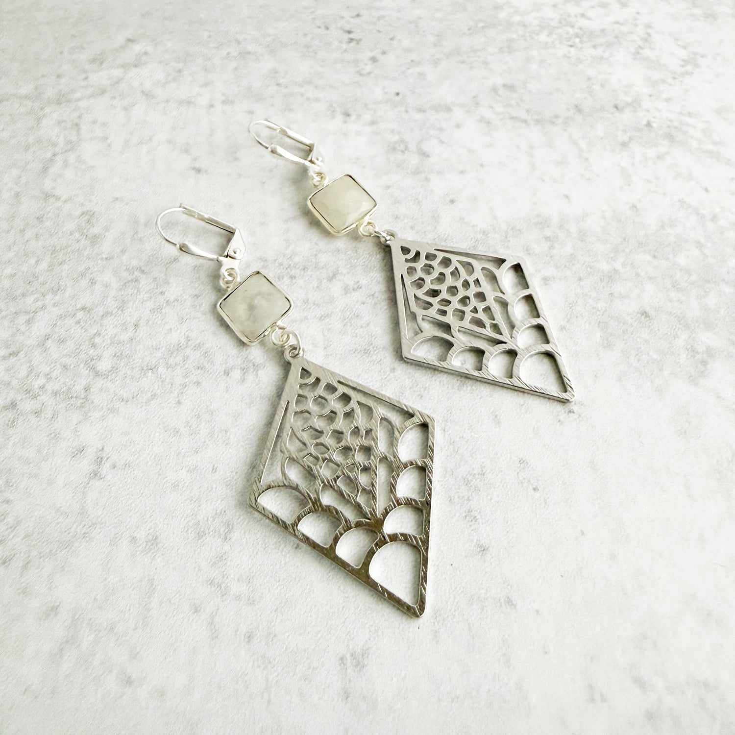 Moonstone and Patterned Diamond Earrings in Brushed Silver