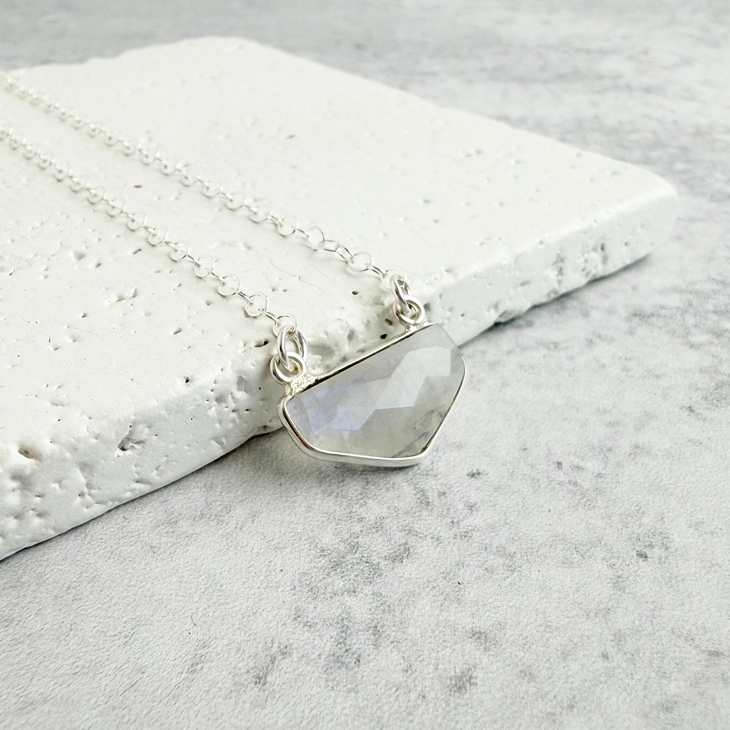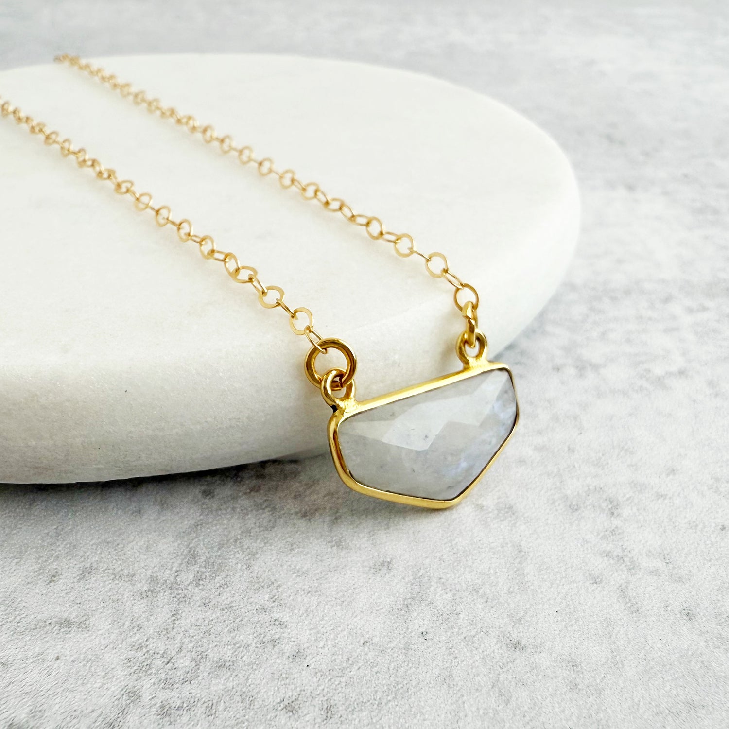 Softly glowing with natural iridescence, the Moonstone Chevron Bezel Necklace is all about quiet confidence and effortless beauty. The angular chevron shape adds a modern edge to this dreamy stone - perfect for layering or wearing solo.