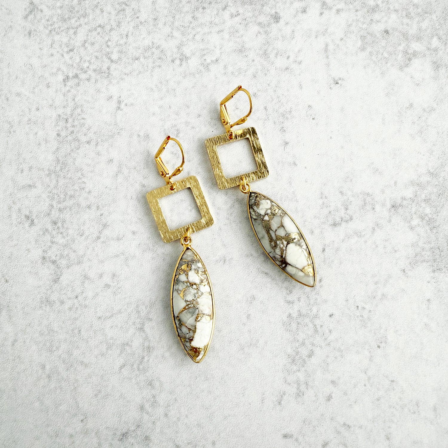 Bright and versatile, these White Mojave Marquise Dangle Earrings bring a touch of warm glow to any outfit. The marbled white stones contrast beautifully with brushed gold for a luminous, easy-to-style statement.